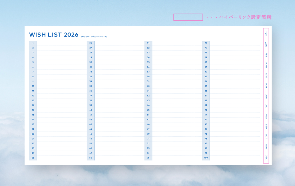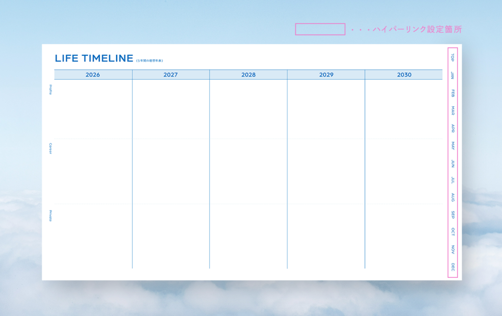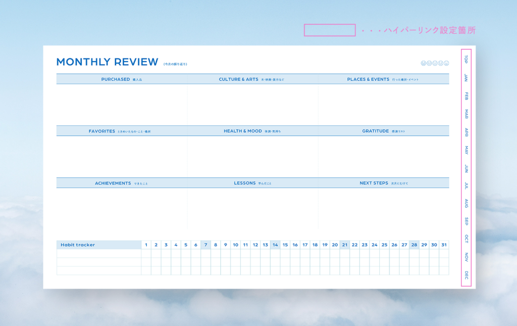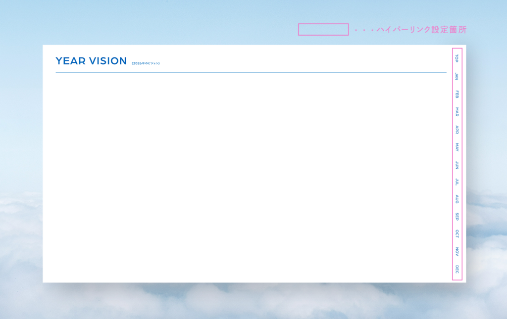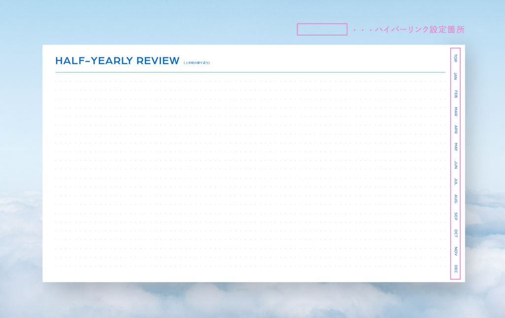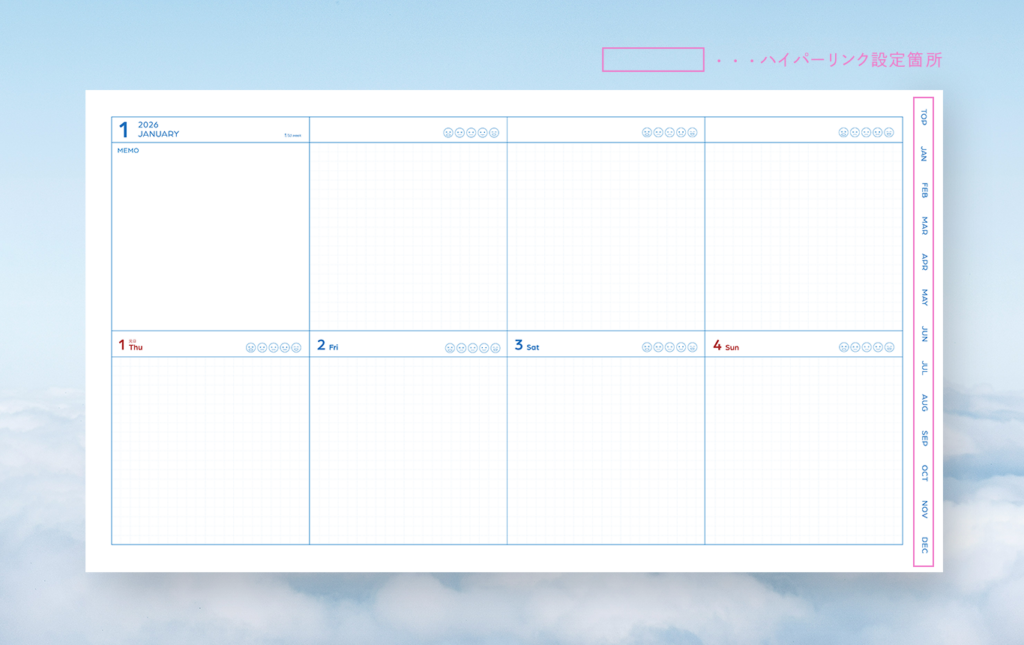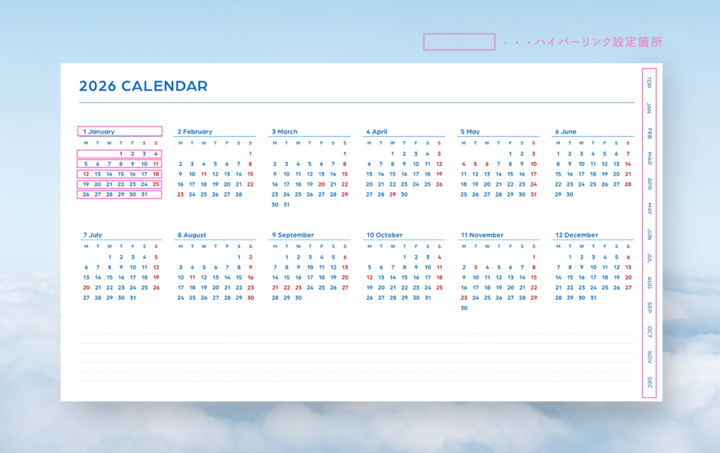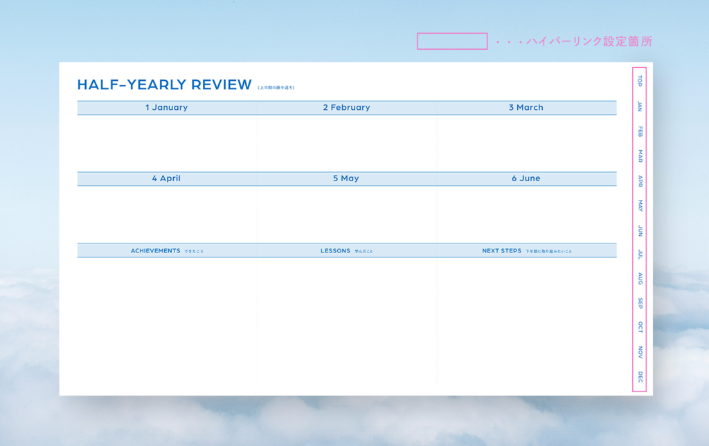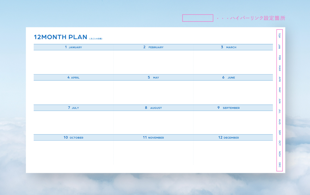 月・週ごとにそれぞれハイパーリンクを設定しているので、ここから希望のページへすぐ飛べます📨
