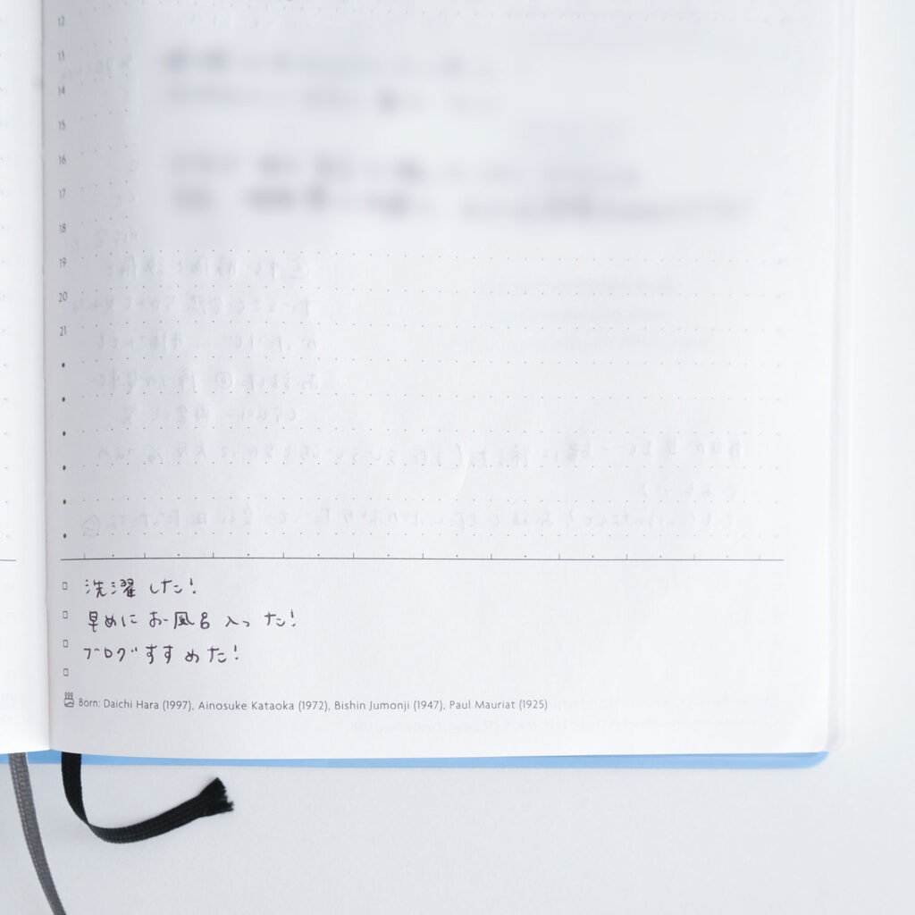 ページ下部のチェックリストには、その日できたことや、心が動いたポジティブな出来事を書いています。