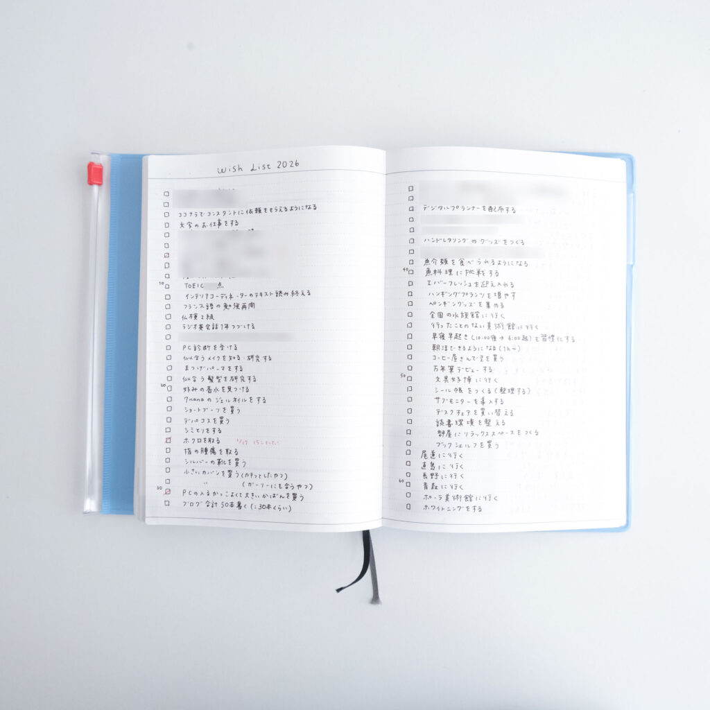 巻末にあるフリーページには、「WISH LIST100」を。達成したらチェックを入れて日付を記入しています。