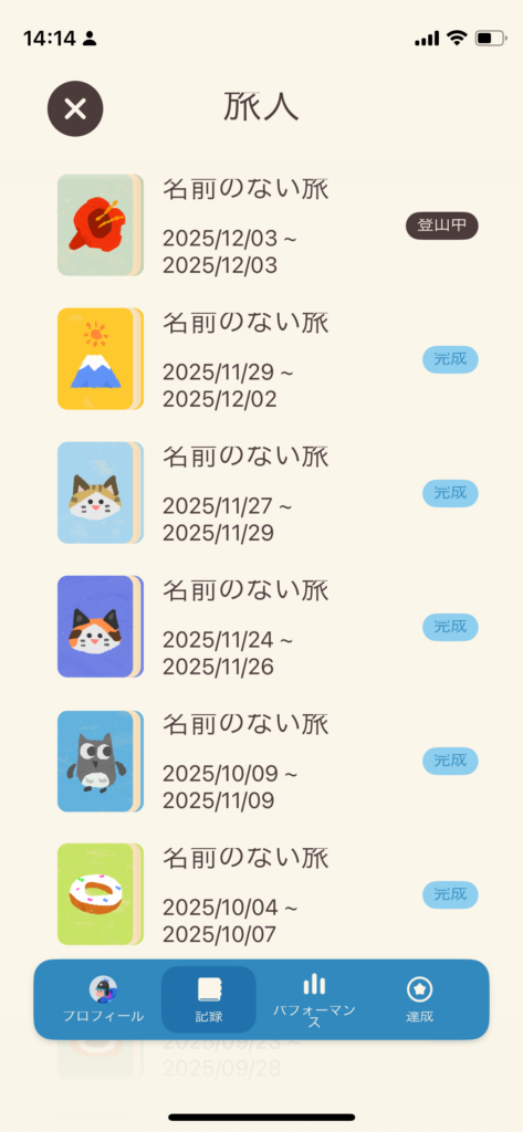 トップページ右上のアイコンをタップ→画面下「記録」から今までの記録を一覧できます。